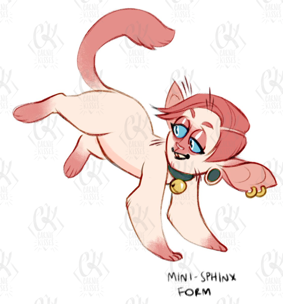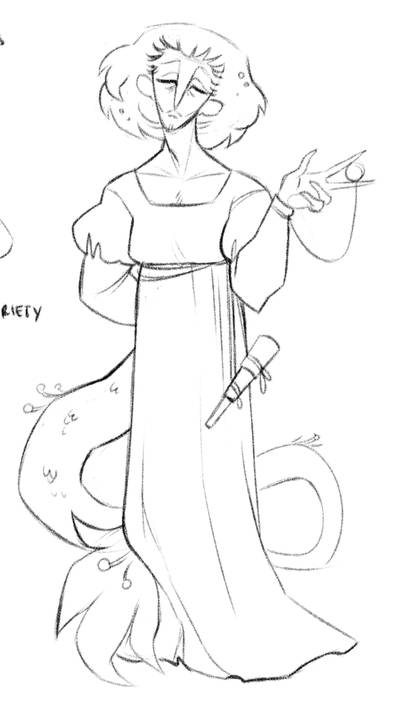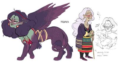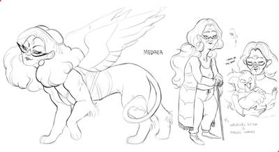 Some bg: Medaea is a witch and Flea's adopted mom, her true form is of a sphinx. The disguise form appears to be much older than her true form, due to Medaea living so long among humans and needing to blend in. This is because her human form is allowed to age unlike her true form, which is near eternal. If she the human dies of old age, so does her true form: to avoid this, Medaea will have to shift back to a sphinx, and therefore go into hiding, never able to go back to human society. also a fun detail that ill probably never be able to follow up on due to my poor language skills, spells are spoken in riddle form