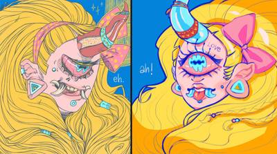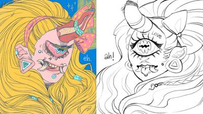 im? sort of?? redrawing a thing from 2016 (on the left) that i never published because the colors are nice but imo it kinda blows overall. It's going to have a bg so thats good