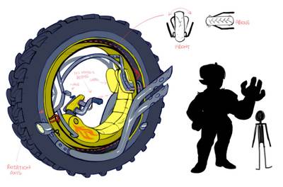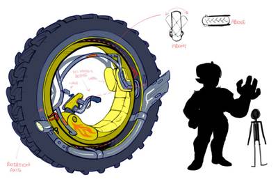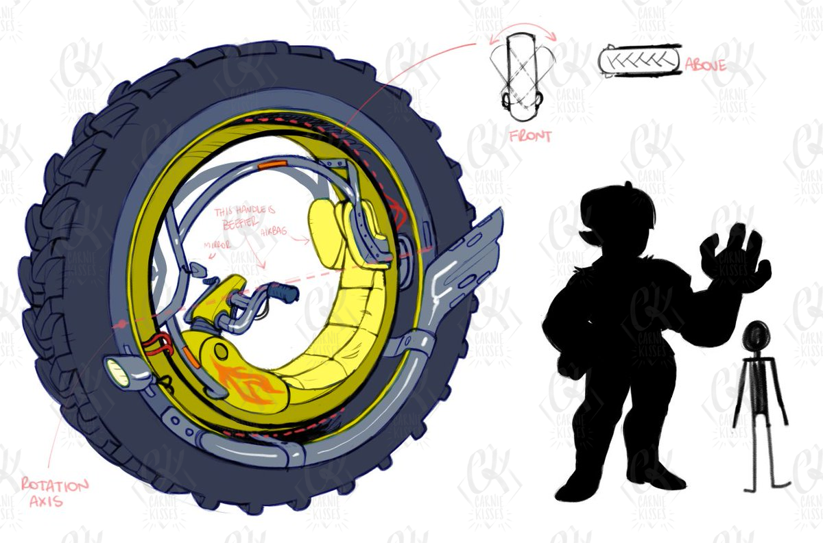 today's effort dfgklk, slapped some color on it to define shapes better and drew the tire as tractor-like to allow for driving on umpaved roads as well (also that's badass). The internal ring should rotate enough to not cause too much whiplash when turning