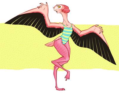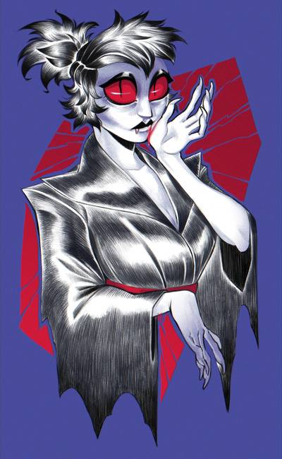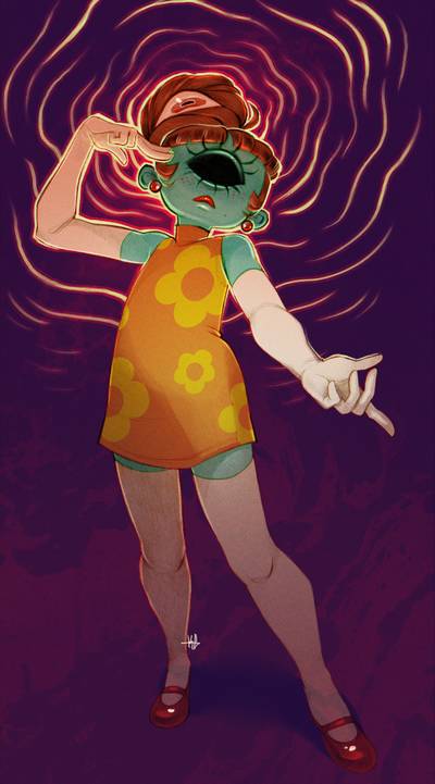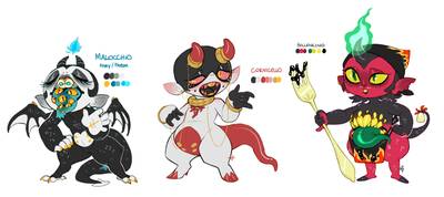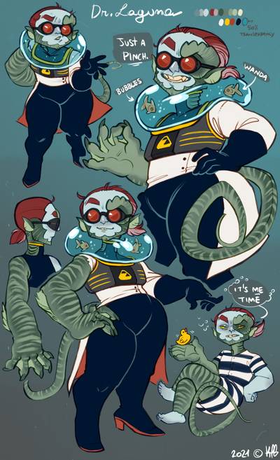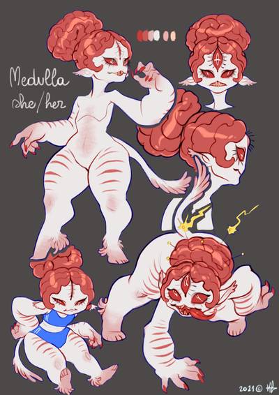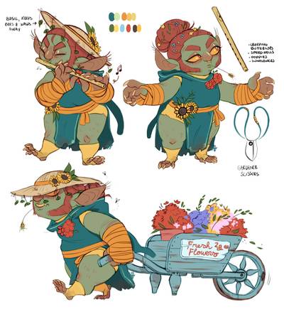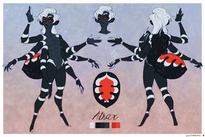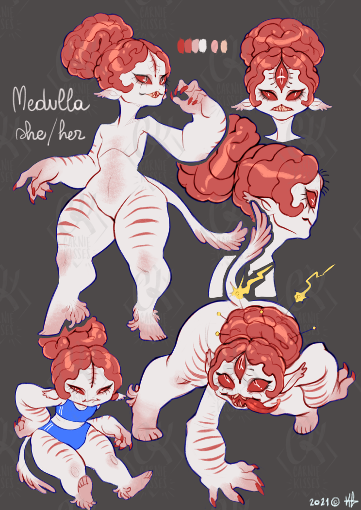 Quick miniref, in which I updated the color scheme: skintone is greenish and the reds are more saturated. Added a couple design notes for myself as well
