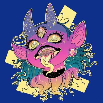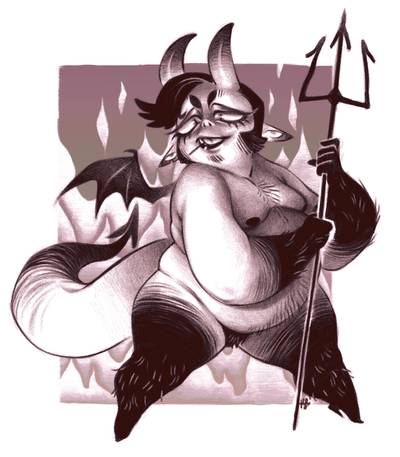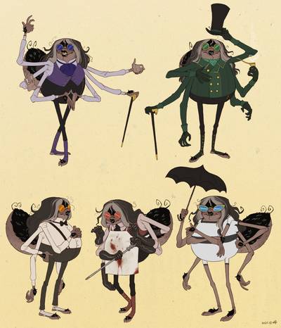 From left to right, Farfarello (he/him), Dr. Stranamore (he/him), Ciriatto (any), Mr. Magpie (he/him), Cupid (he/him), and Satan (she/her)