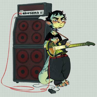 all i can think of is that scene from back to the future with the big amp where marty strums his guitar Once & he flies the fuck into a wall, except this amp wouldn't be that powerful at all he's just an itty bitty little man